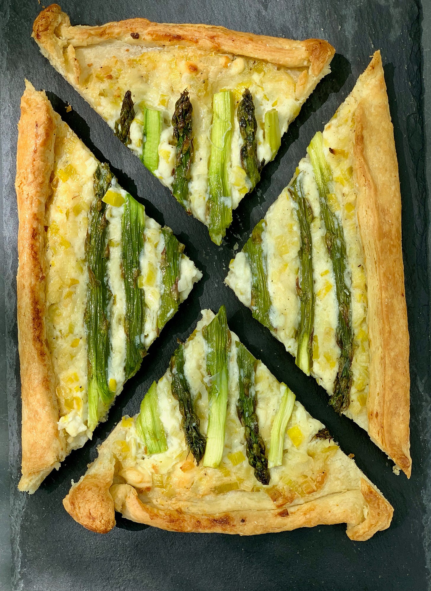 ½ cup Leeks, cleaned and thin sliced ½ cup Heavy Cream plus 2 Tbsp Cream reserved 2 Tbsp Grated Parmesan Cheese or Crumbled Feta 6-7 Asparagus Spears, woody ends snapped off 1 Tbsp Unsalted Butter 1/2 tsp Kosher Salt Fresh cracked pepper ¼ portion of fresh pie dough (above recipe)