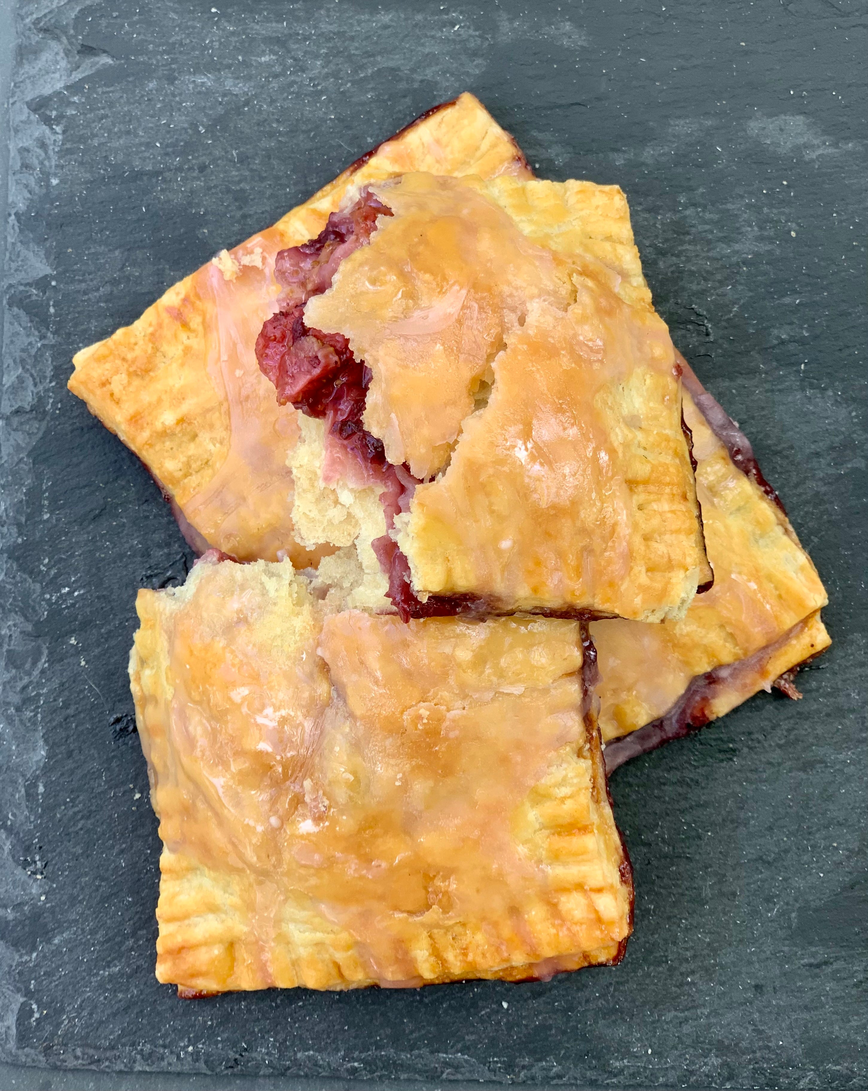 Flour a work surface and roll out a quarter portion of pie dough into ¼ inch thick rectangle. Slice the dough into six rectangles so you have a top and bottom piece for 3 tarts. Scoop 2 tablespoons of filling onto 3 pieces of dough. Brush heavy cream around the edge of the berry filling on each tart. Place a fresh piece of rectangle dough over the top and stretch it a bit to cover all the filling. Use a fork to tightly crimp down the dough all the way around the pastry, sealing in the filling. Place on a parchment lined sheet tray. Brush the entire top with remaining cream from the bowl. Bake for 30 minutes, until golden brown. Filling may leak out of the tarts but that’s ok there is plenty inside.